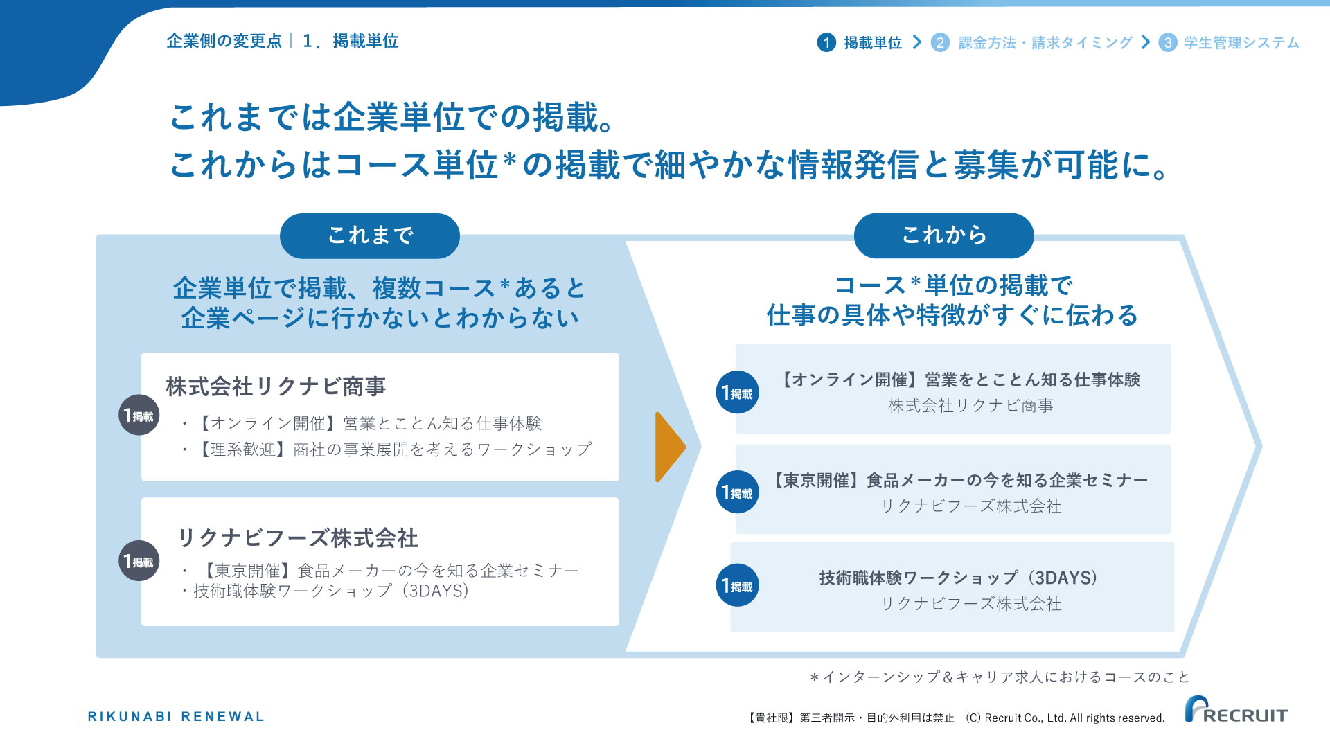 これまでの『リクナビ』は、「企業単位」での情報掲載でしたが、「仕事」の中身をより具体的に伝えられるように、「コース単位」の情報掲載に変わります。